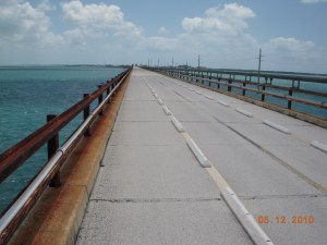 One reason you want to do that is because you have to stand on the bridge to get a sense of just how narrow it is. It was converted to an auto bridge from what was left of Flagler’s rail bridge after the Labor Day hurricane of 1935, and the highway builders didn’t widen it much beyond a standard rail bridge, as you can see. There’s no photographic trickery going on in that photo–my bike is nearly a lane wide. Now picture being in a typical 1960’s sized car, midway on this length of bridge (which was two miles), fighting wind gusts and with a truck coming the opposite direction. Oh yeah, and there are sharks in the water. (Our friend Kate got a picture of the one we saw–we saw a number of rays as well.) The most scared I’ve ever been behind the wheel was when I drove up the side of the Capulin Volcano in New Mexico on the outside lane with no guardrails. This, I imagine, would be close.