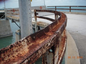Here, at least, there are guardrails, made from the railroad steel from the original bridge. They’ve rusted considerably, and I wonder if there are any plans to maintain them for pedestrians and bikers in the future. On the unmaintained part of the bridge (seen from the new bridge), many of the rails have rusted away completely. There’s also a tree growing up out of the new bridge–wish I’d gotten a photo of it, but I was driving at the time, and the bridge, while spacious by comparison, still requires full attention.