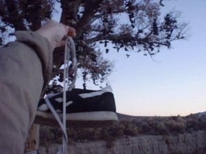 That’s Amy holding her shoes, the ones she brought specifically to sling into the tree, and that’s me trying to get them up there as well. We were standing in near zero degree temperatures, and for a couple of people who don’t particularly like it when it gets down to fifty, that’s a major sacrifice.
