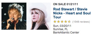 This is a good example of the kind of musical acts we get here in south Florida. That’s an image from the Ticketmaster email I got last night. Now I will cop to having had (and probably still having, to some extent) a Stevie Nicks crush starting back when I was, oh, 9 or so. But I’ve never been a Rod Stewart fan, not in any of his incarnations, though I find his “Every Picture Tells a Story” phase the okay-est of the bunch.