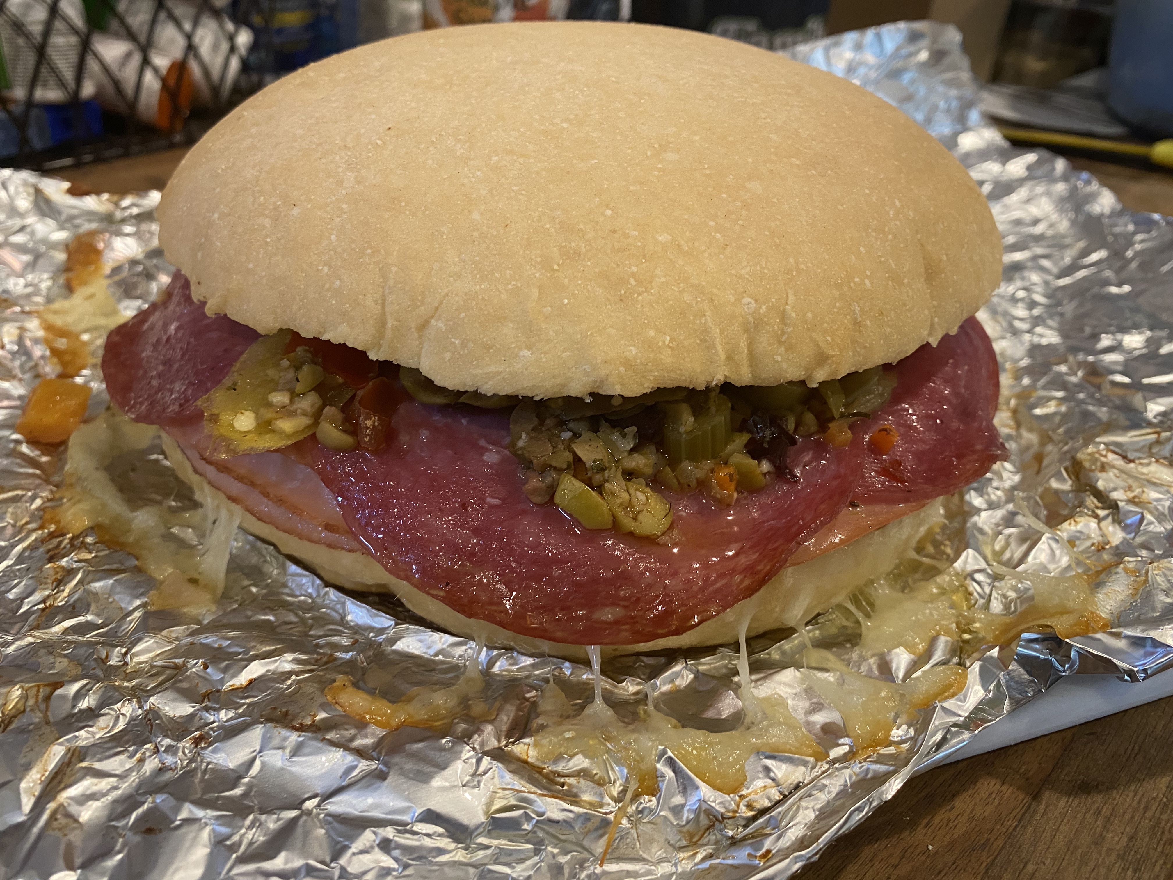 Which takes me back to that idea I had when Sandra mentioned the anthology. There’s a little specialty grocery in my neighborhood that does pretty good food most of the time. They have an excellent bakery in the basement, and I worked there for a while, selling wine and beer. They also have a café and sell pre-made sandwiches and for one brief moment, they had something in there they called a muffuletta.