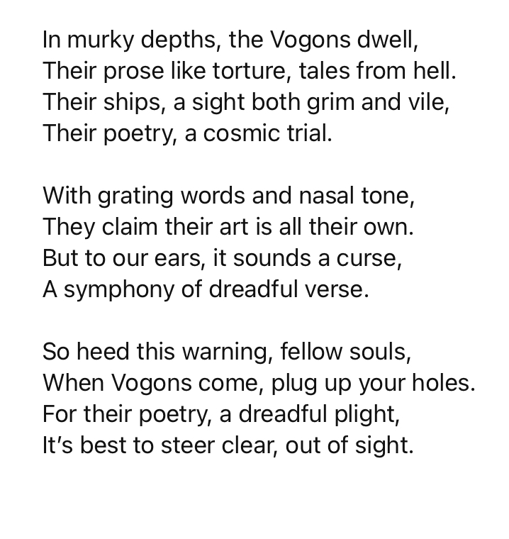 “Now Earthlings…” whirred the Vogon…”I present you with a simple choice! Either die in the vacuum of space, or…” he paused for melodramatic effect, “tell me how good you thought my poem was!”